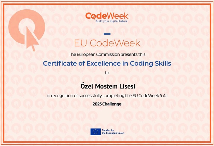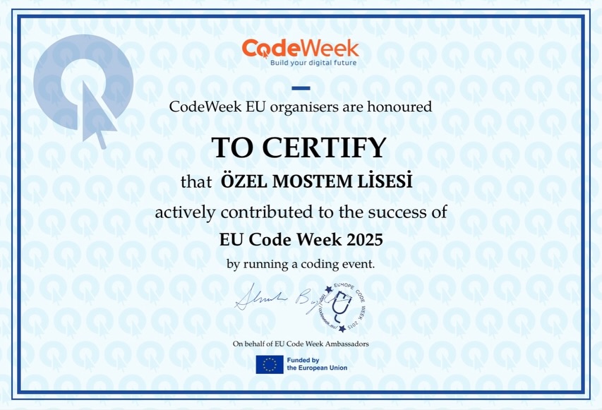 Özel Mostem Lisesi olarak EU CodeWeek 4 All Challenge 2025’i başarıyla tamamladık ve öğrencilerimizin kodlama becerileri Avrupa çapında takdir edildi! EU CodeWeek 2025, 11–26 Ekim 2025 tarihleri arasında gerçekleşti ve genç kodlayıcıları, öğretmenleri ve dijital beceri meraklılarını bir araya getirerek yaratıcılık ve dijital beceri gelişimini kutladı.