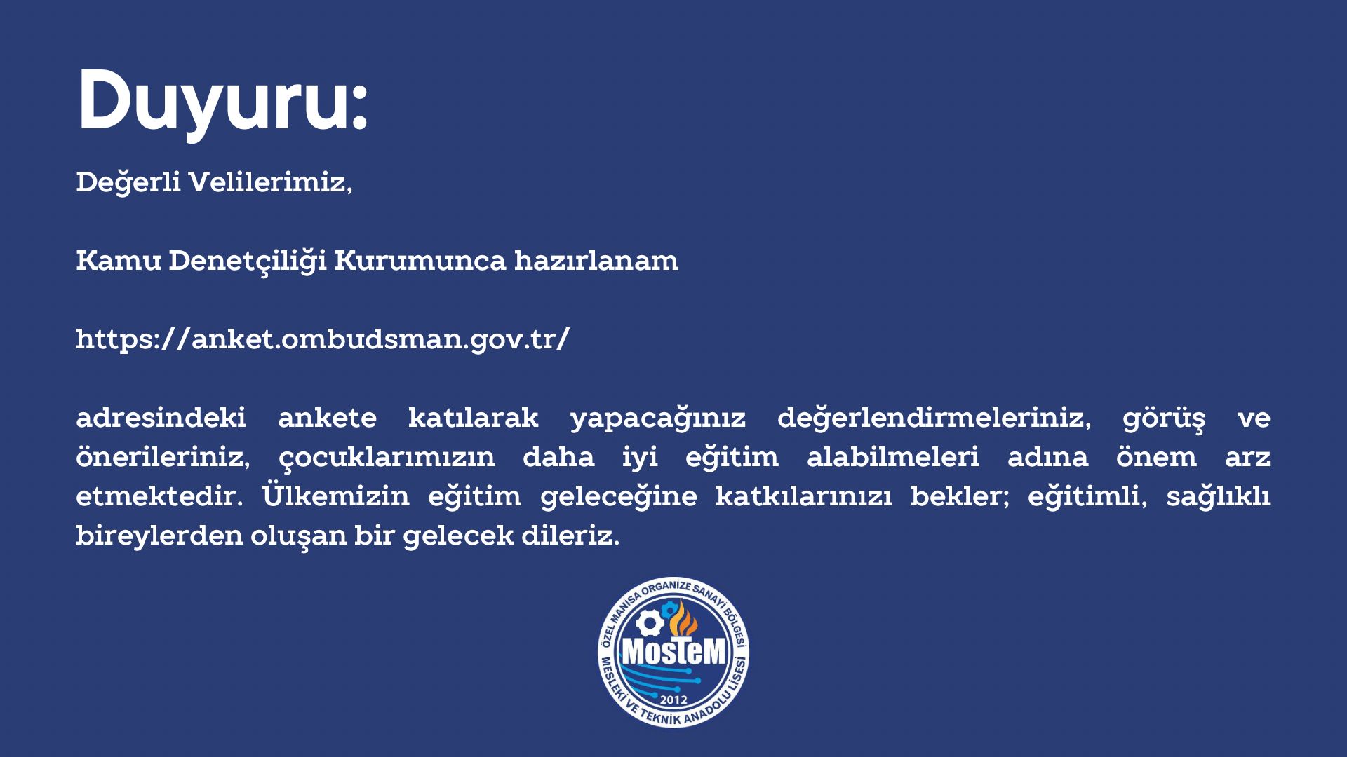adresindeki ankete katılarak yapacağınız değerlendirmeleriniz, görüş ve önerileriniz, çocuklarımızın daha iyi eğitim alabilmeleri adına önem arz etmektedir. Ülkemizin eğitim geleceğine katkılarınızı bekler; eğitimli, sağlıklı bireylerden oluşan bir gelecek dileriz.